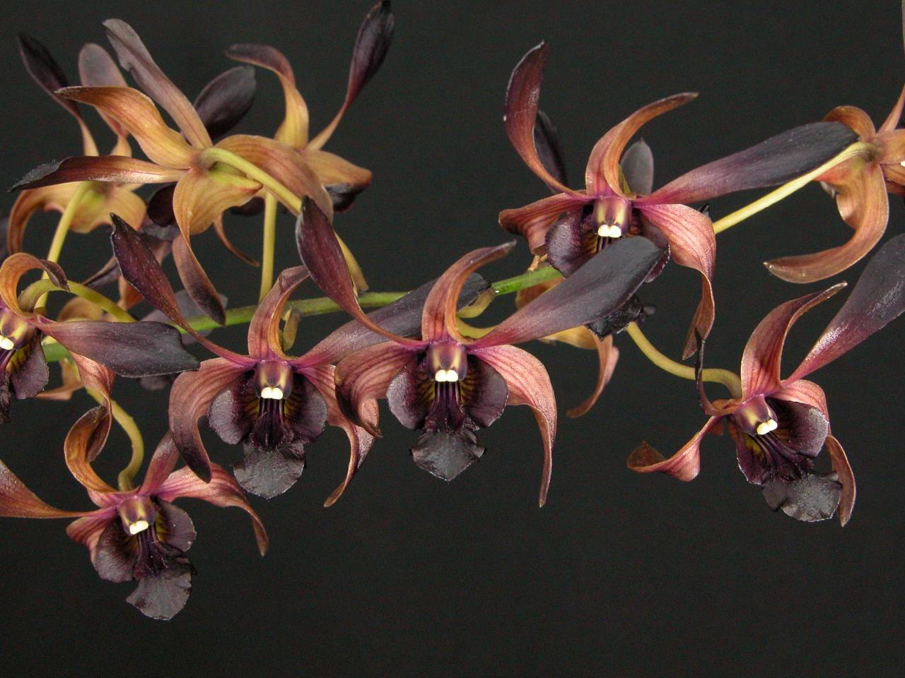 I picked up this Dendrobium Black Spider at an orchid show in Indianapolis this past September. It was sitting on a vendor's table being more or less ignored by everyone there, and for the life of me I can't figure out why. I've never seen a dendrobium so close to black before, and I figured that just about any orchid enthusiast would be really excited. Their loss, I suppose. This plant was nearly in full bloom in September, and it's still going strong now in November.