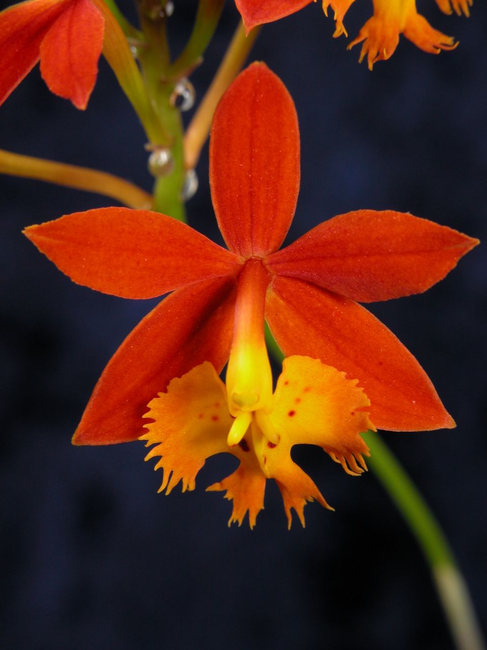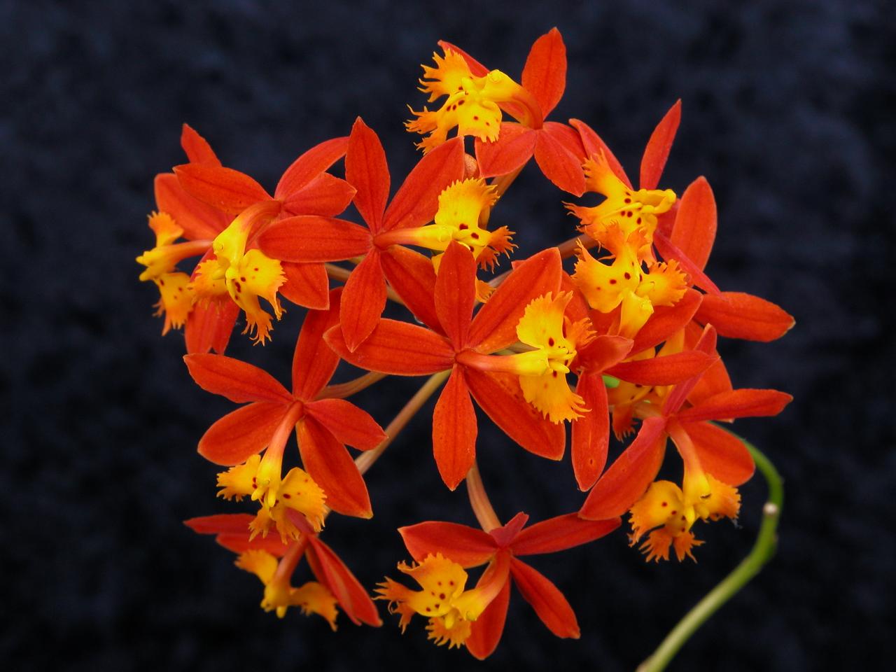 I acquired this Epidendrum radicans as a "bonus orchid" when I purchased Cookara Bill several years ago. When I got it, it couldn't have been more than three inches tall, with a single bare root. Since then, it's grown to several feet in height; this plant is currently five feet tall counting the flower spike. Each spring, it put up a spike or two of brilliant orange flowers.