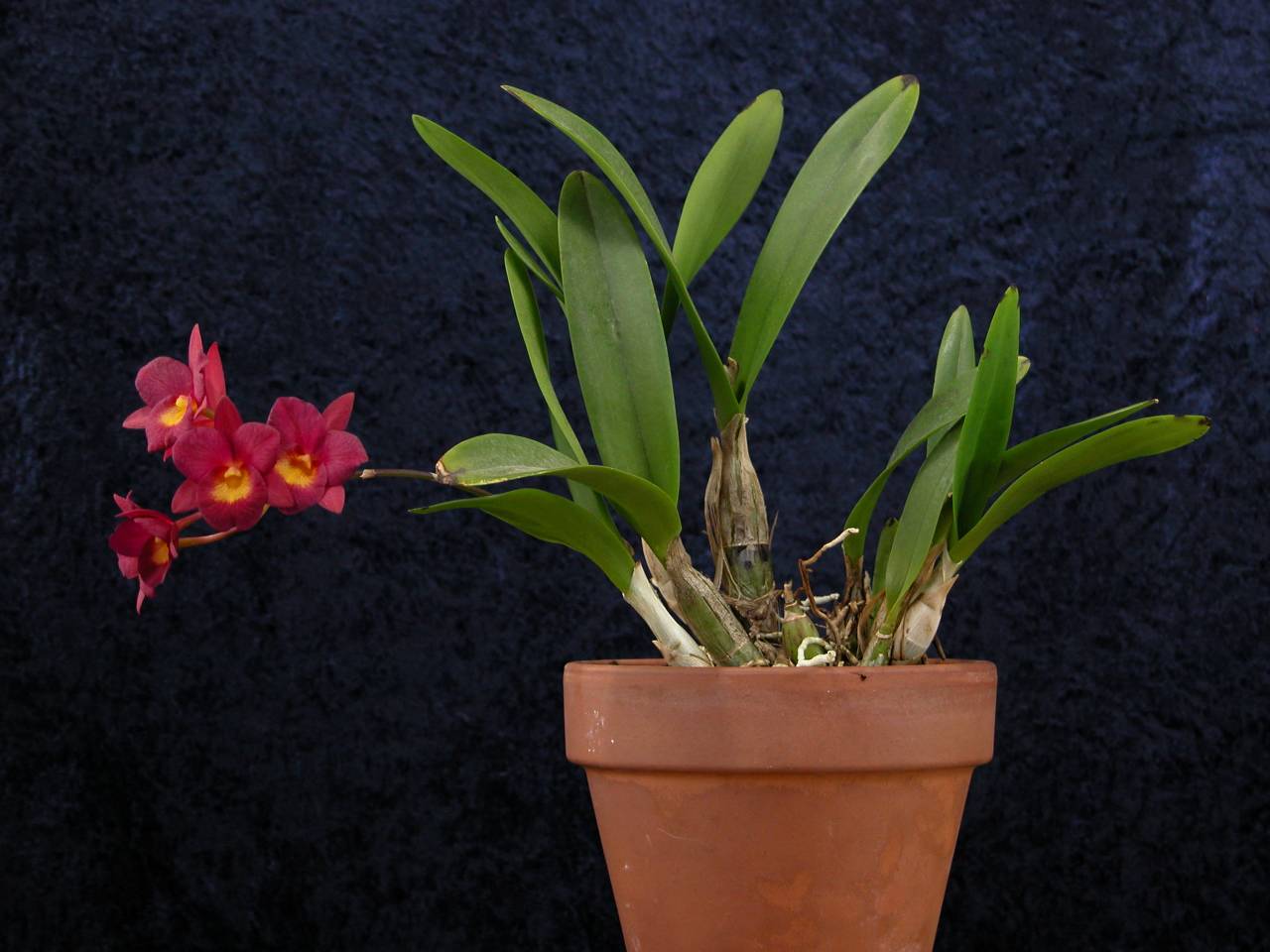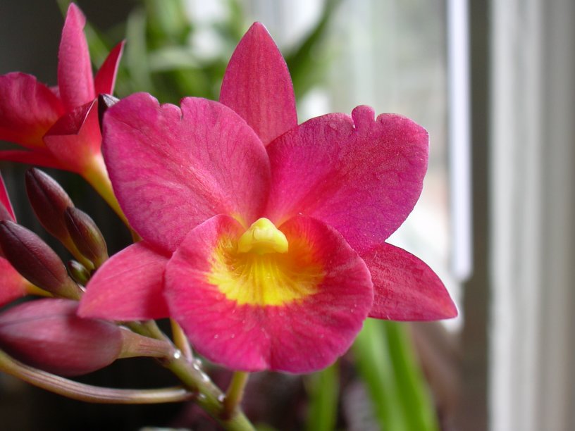 I picked up this little red gem of a Ctna. Why Not 'Comet' x Ctna. Why Not 'Radiance' from Orchids by Hausermann in the spring of 2004, since I always seem to be short on bright red flowers on my plants. It was overgrown in the little three inch pot that it came in, not to mention having more than one lead flowering. It's a miniature hybrid, which makes for a relatively short plant with clusters of 1 1/4" flowers. It flowered in the wintertime and is now flowering again this spring.